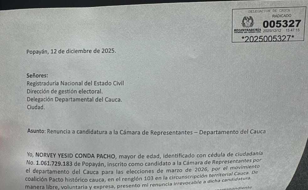 A pocos días del cierre definitivo de modificaciones de listas para las elecciones legislativas de marzo de 2026, el Pacto Histórico en el Cauca sufre un revés en su arquitectura electoral. En la tarde de este viernes 12 de diciembre, Norvey Yesid Conda Pacho radicó ante la Delegación Departamental de la Registraduría Nacional su renuncia "libre, voluntaria e irrevocable" a su aspiración a la Cámara de Representantes. El documento, conocido en exclusiva por Periódico Virtual.com, confirma la salida del candidato que ocupaba el renglón 103, agudizando la incertidumbre sobre la unidad de la coalición de gobierno en el departamento.