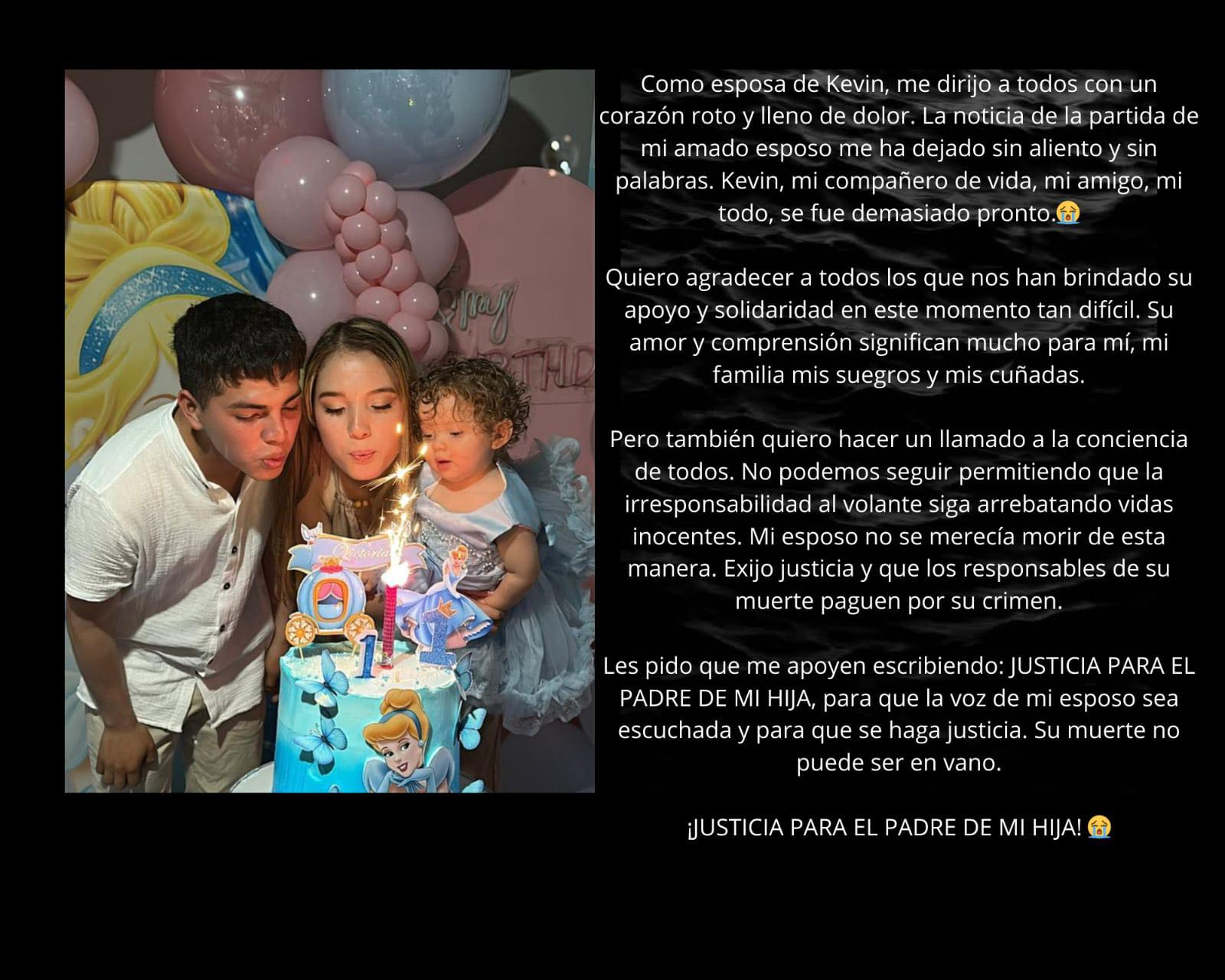 A través de un mensaje público, la esposa de Kevin, Luisa Muñoz, expresó su profundo dolor por la inesperada partida de su compañero de vida y pidió a la comunidad unirse para exigir justicia.