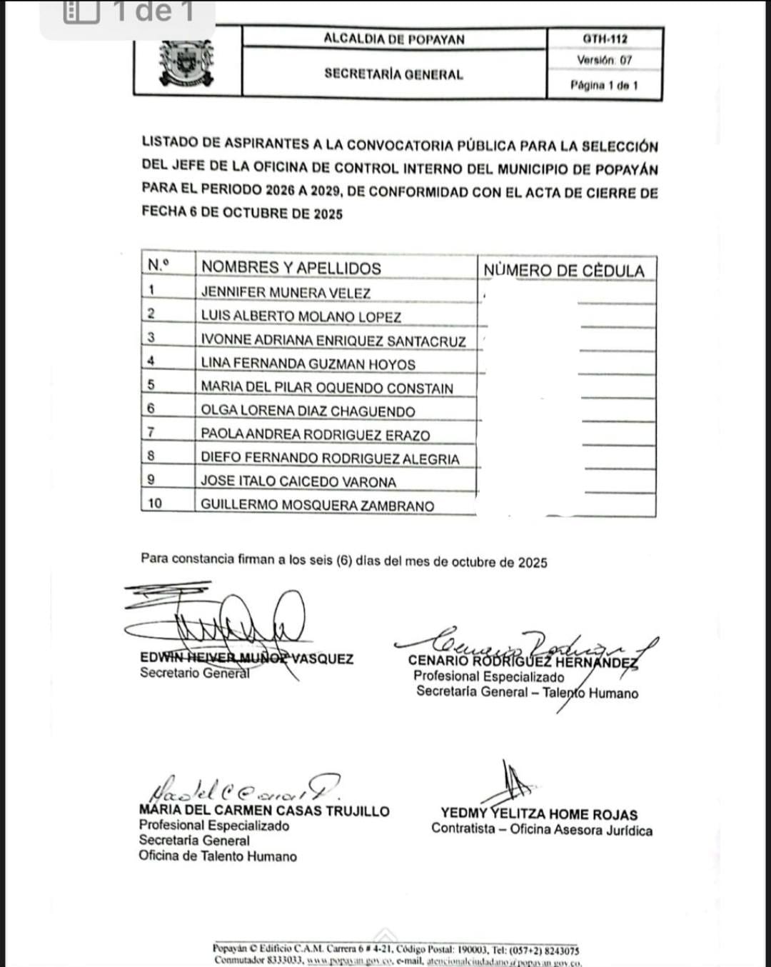 El listado oficial de aspirantes a la Jefatura de Control Interno del Municipio de Popayán (2026–2029) confirma lo que se murmura en los pasillos del Palacio Municipal: la baraja estaría marcada.