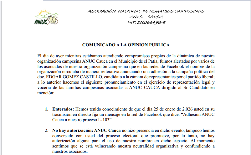 No cesan los cuestionamientos contra la aspiración de Edgar Gómez Castillo a la Cámara de Representantes. En un contundente comunicado a la opinión pública emitido el 26 de enero de 2026, la Asociación Nacional de Usuarios Campesinos (ANUC) - Cauca desmintió categóricamente cualquier vínculo oficial con su proceso político.