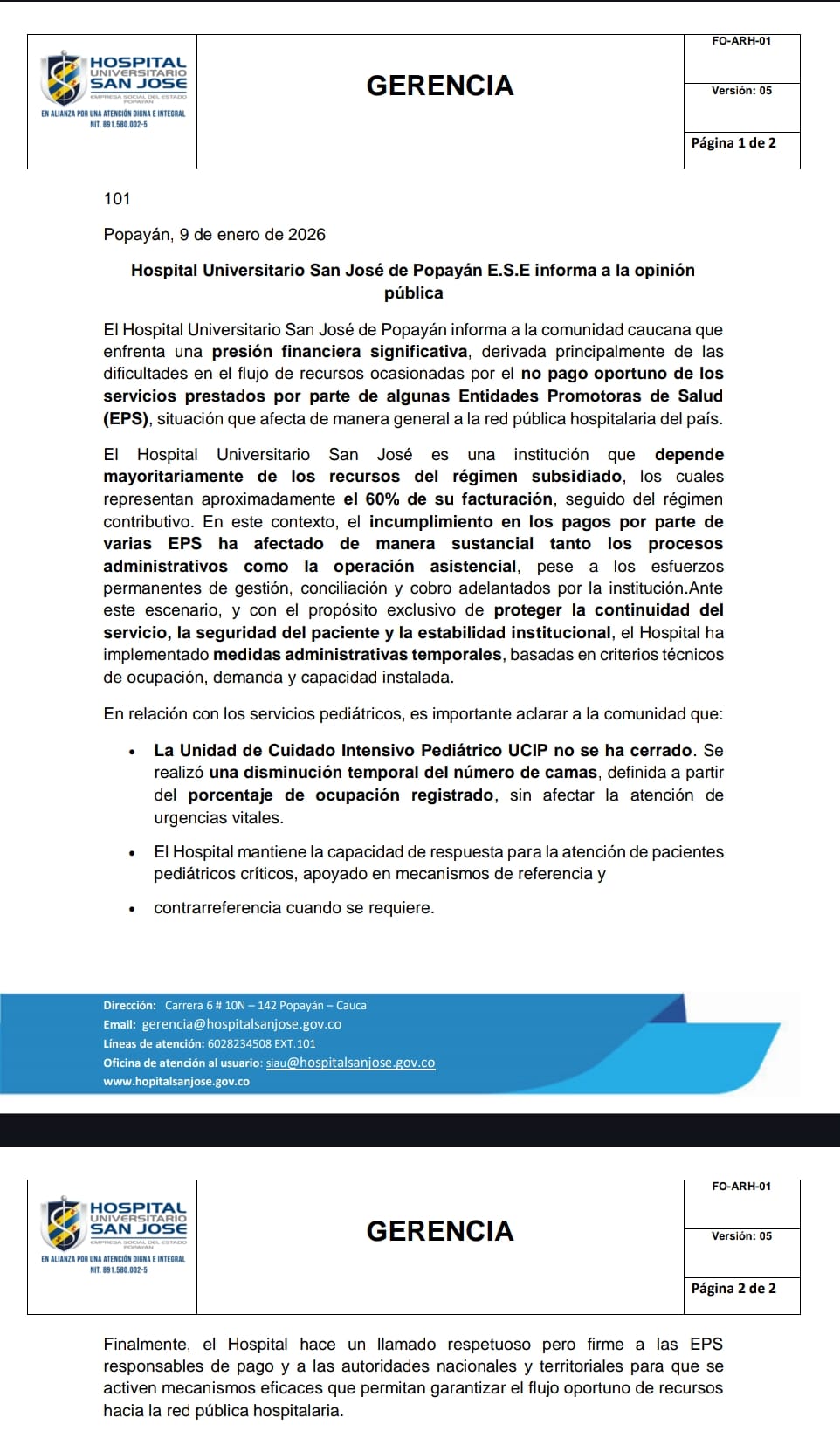 A través de un comunicado oficial emitido el 9 de enero de 2026, la gerencia del Hospital Universitario San José de Popayán E.S.E. alertó a la comunidad sobre la crítica presión financiera que enfrenta la institución.