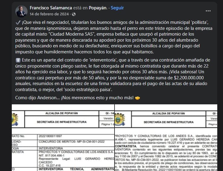 Todo esto confirma lo que desde este medio venimos advirtiendo: la creación de Ciudad Moderna en la administración de Juan Carlos López Castrillón, con la facultad otorgada por los 19 concejales de la época, no fue modernización sino una trampa financiera de 30 años que amarra a Popayán. Además pidió que se certifique si el privado realmente asumió los $34.000 millones que le correspondían, cuestionó por qué el inventario del alumbrado se tasó en $6.000 millones y lanzó la denuncia más delicada: la interventoría estaría recibiendo $120 millones mensuales (es decir, $1.440 millones al año) y, si se mantiene por los 30 años de la concesión, le costaría a la ciudad $43.200 millones, una cifra escandalosa para una ciudad que “sigue a oscuras”. Su intervención fue clara, técnica y política a la vez: Popayán está pagando intereses de lujo por una deuda que no le deja beneficios visibles y lo hace bajo un modelo que, tal como está, beneficia al acreedor y empobrece al municipio.