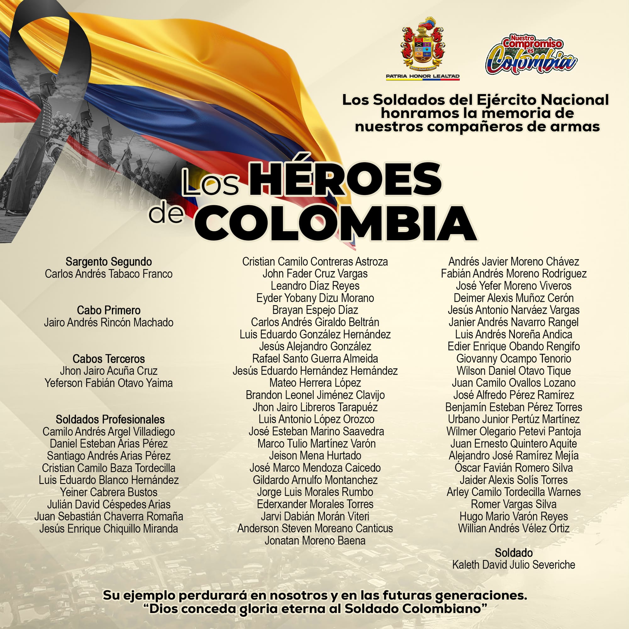 El homenaje fue acompañado de un mensaje institucional en el que el Ejército expresó: “Honramos la memoria de nuestros compañeros de armas”, resaltando que su legado permanecerá en la historia del país.