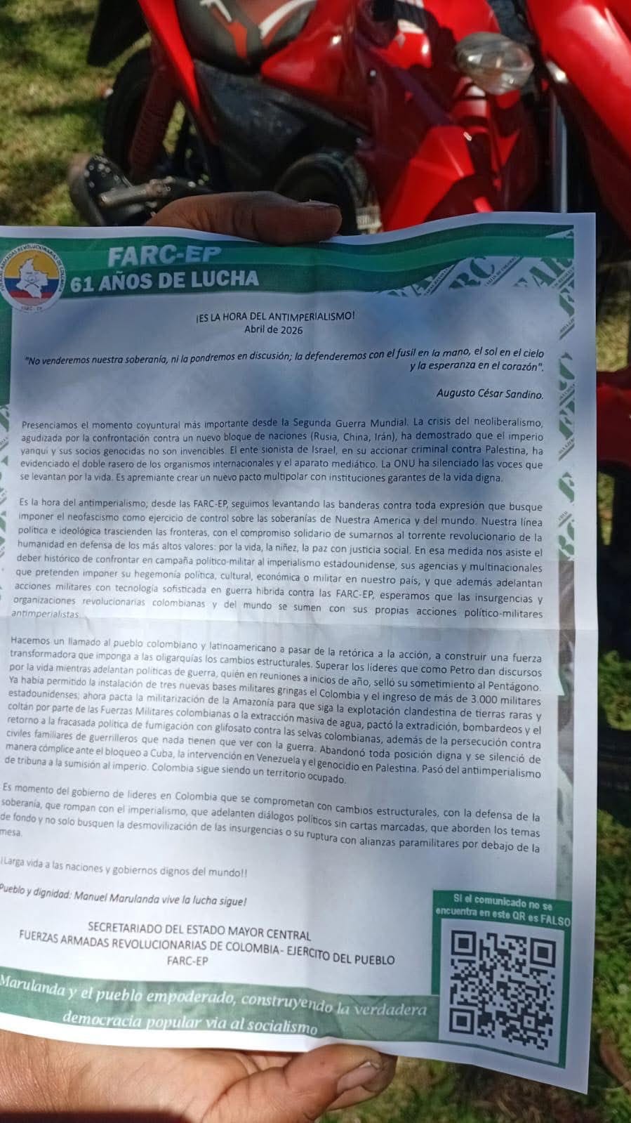 En contraste con la sangre derramada en la Panamericana, el panfleto físico que el EMC ha distribuido en abril de 2026 apela a un discurso geopolítico. Bajo el título "¡Es la hora del antiimperialismo!", el grupo conmemora sus "61 años de lucha" lanzando severas acusaciones contra el gobierno del presidente Gustavo Petro, al que tildan de ejecutar "políticas de guerra" bajo un falso discurso de paz.