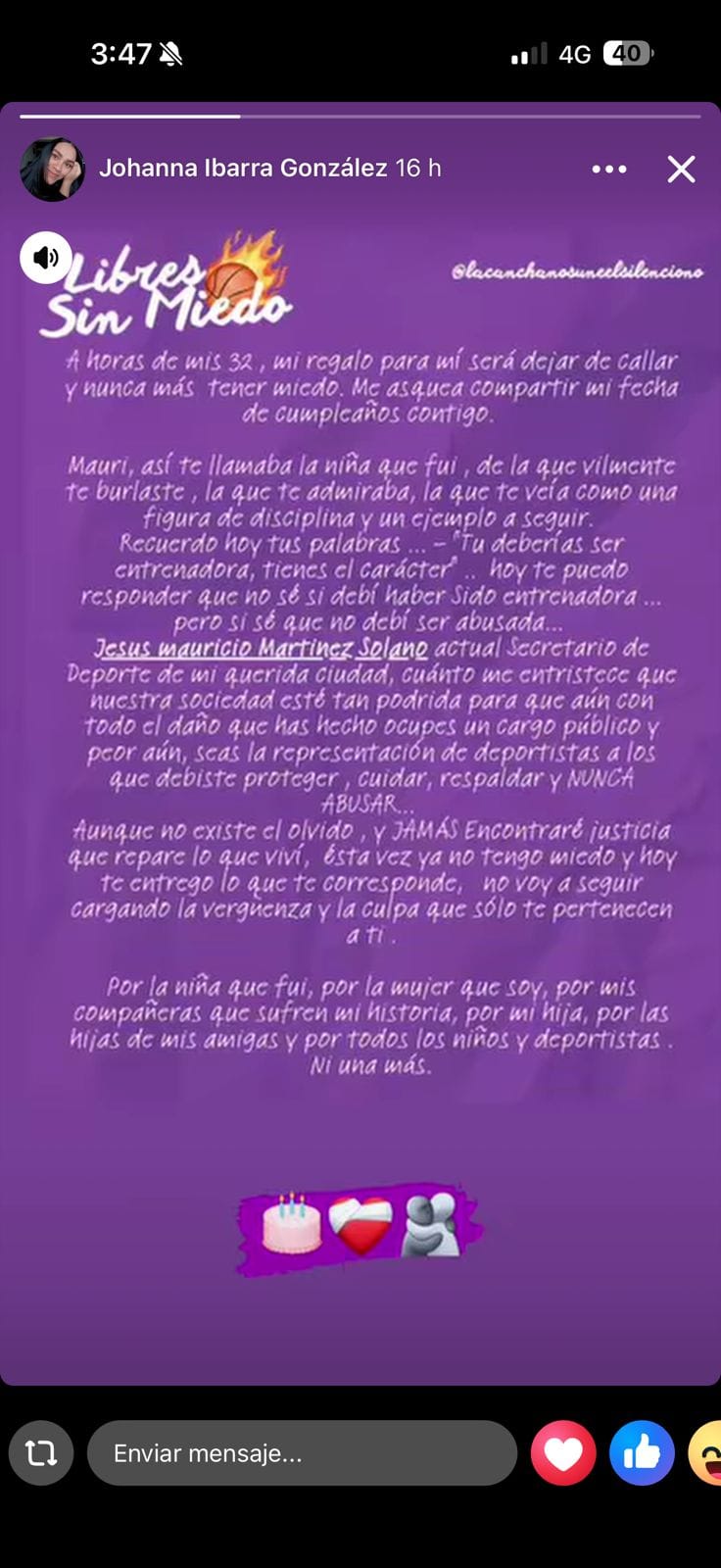 A través de su campaña personal titulada "Libres Sin Miedo", Ibarra compartió un desgarrador testimonio a pocas horas de cumplir 32 años. En su declaración, describe cómo la persona a la que admiraba y veía como un ejemplo a seguir, presuntamente se aprovechó de su posición de poder.