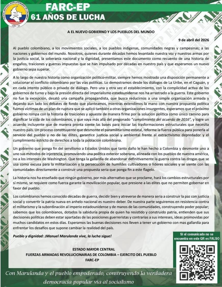 A través de un comunicado de prensa fechado el 9 de abril de 2026, las autodenominadas estado mayor central FARC-EP difundieron un mensaje dirigido al nuevo gobierno de Colombia y a la comunidad internacional, en el que plantean su visión sobre el conflicto armado y proponen una serie de cambios estructurales en el país.
