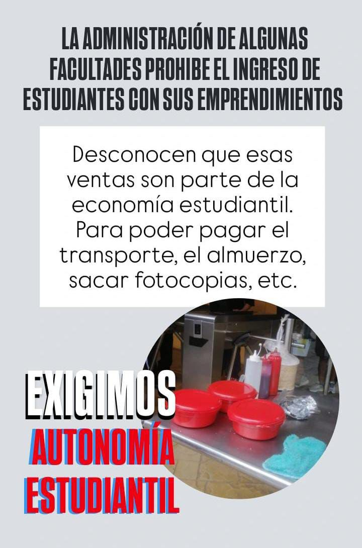 Otro de los puntos de molestia es la denuncia de estudiantes que aseguran que algunas facultades estarían restringiendo el ingreso de alumnos que venden productos dentro de la universidad, actividad que muchos utilizan para financiar sus estudios.