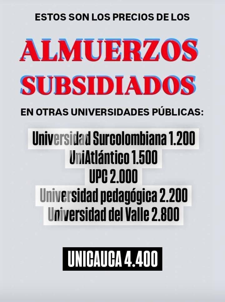 Los estudiantes difundieron comparaciones con otras instituciones públicas, señalando que en universidades como la Surcolombiana, la del Atlántico o la del Valle, los costos de almuerzo subsidiado son considerablemente más bajos.