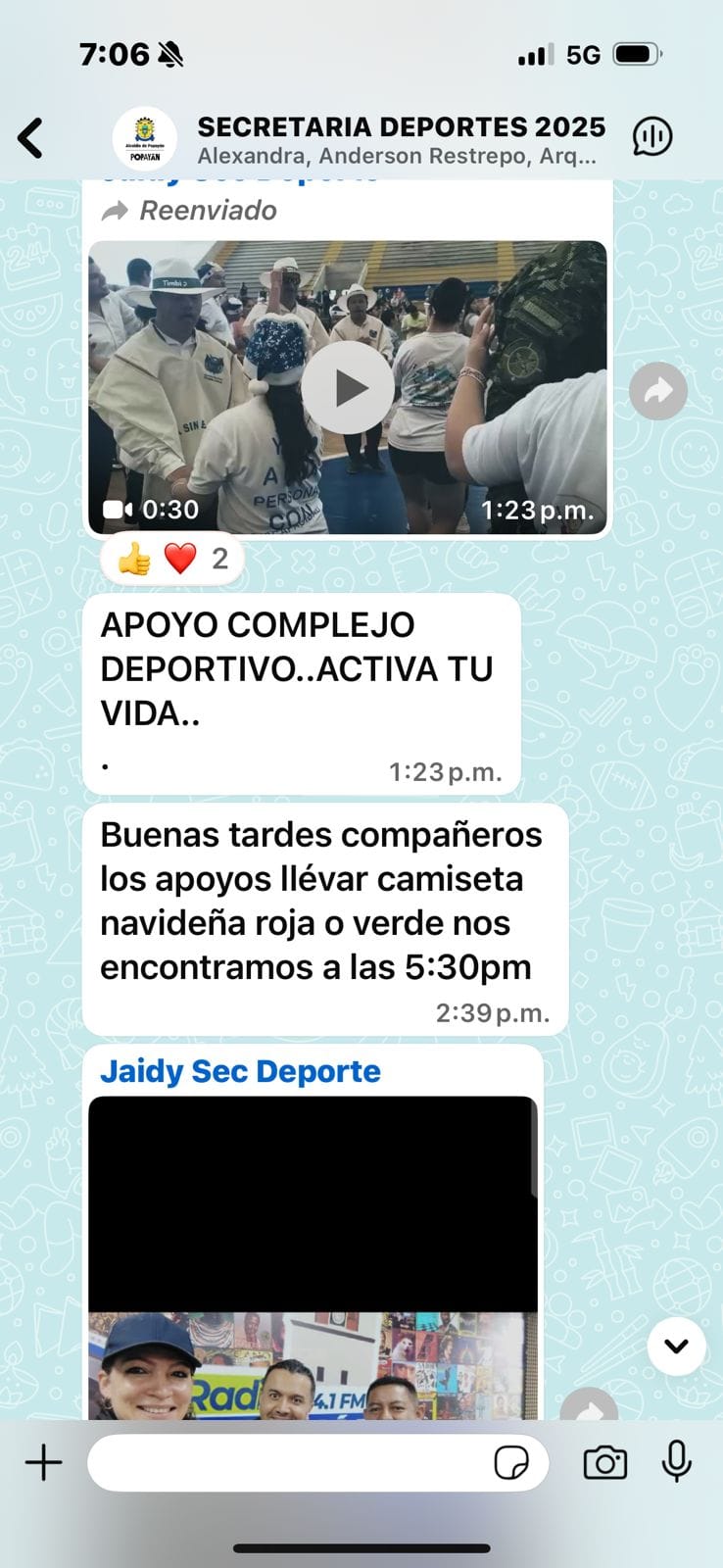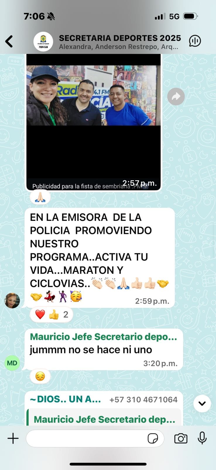 En las últimas horas, Periódico Virtual.com tuvo acceso a capturas de pantalla de un grupo interno de WhatsApp denominado "SECRETARIA DEPORTES 2025". En la imagen, miembros del equipo de comunicaciones y logística reportan actividades de promoción del programa "Activa tu vida" en la emisora de la Policía, una labor fundamental para visibilizar la oferta institucional.