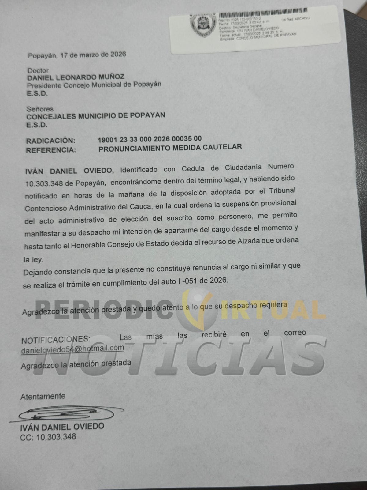 A través de un documento radicado ante el Concejo Municipal de Popayán, al cual tuvo acceso esta redacción, Oviedo manifestó que acata la disposición judicial y se aparta del cargo “desde el momento y hasta tanto el honorable Consejo de Estado decida el recurso de alzada”.