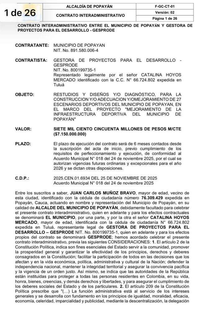 El documento contractual (F-GC-CT-01), que hoy reposa bajo el escrutinio público, tiene como objetivo los "estudios, diseños y/o diagnóstico, para la construcción y/o adecuación de 27 escenarios deportivos del municipio de Popayán". Para esta labor, se eligió a Gesprode, bajo la representación legal de Catalina Hoyos Mercado, otorgándole un plazo de ejecución de seis meses amparado en vigencias futuras.