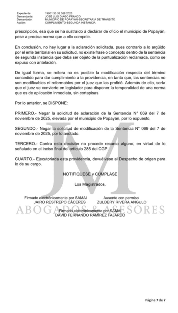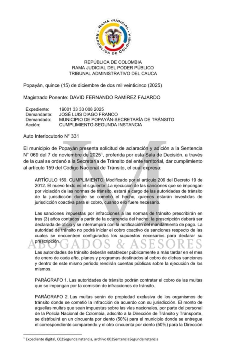 Se acabaron las maniobras dilatorias. El Tribunal Administrativo del Cauca, mediante el Auto Interlocutorio N° 331 fechado este 15 de diciembre de 2025, ha negado rotundamente la solicitud del Municipio de Popayán que pretendía pedir una "aclaración y adición" a la sentencia que los obliga a borrar las multas prescritas. El Magistrado Ponente, David Fernando Ramírez Fajardo, cerró la puerta a más excusas administrativas, dejando en firme la orden de depurar las bases de datos de tránsito de manera inmediata.