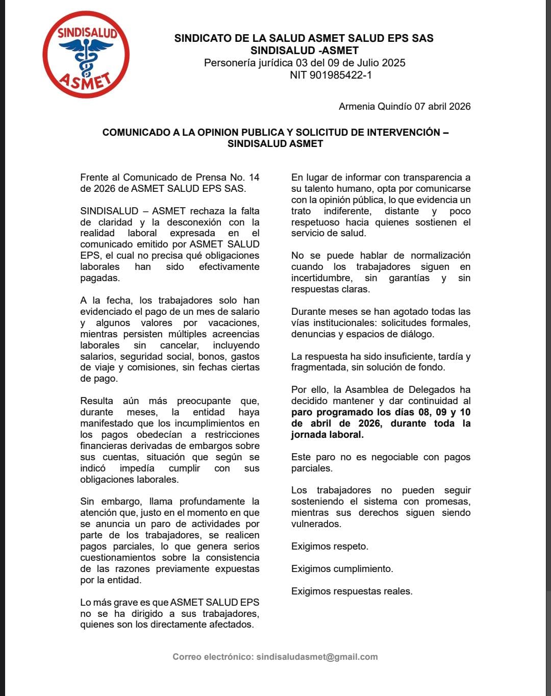 El Sindicato de la Salud Asmet Salud EPS SAS (SINDISALUD ASMET) anunció de manera oficial el cese de actividades durante los días 08, 09 y 10 de abril de 2026. La medida de fuerza surge como respuesta al rechazo rotundo de los trabajadores frente al comunicado de prensa No. 14 de la entidad, al que califican como una "desconexión con la realidad laboral" y una falta de transparencia sobre las obligaciones financieras que aún se adeudan al talento humano.
