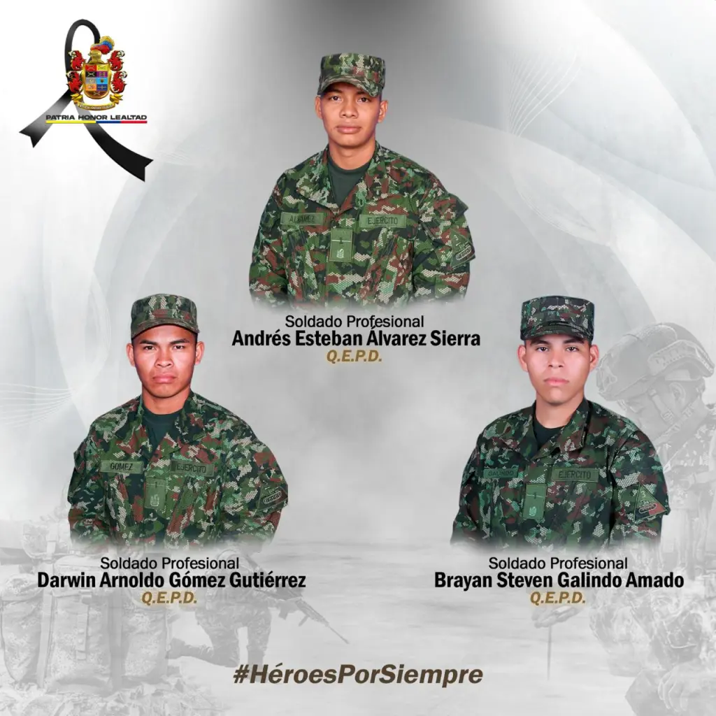 En el ataque murieron tres soldados profesionales identificados como Andrés Esteban Álvarez Sierra, Darwin Arnoldo Gómez Gutiérrez y Brayan Steven Galindo Amado.