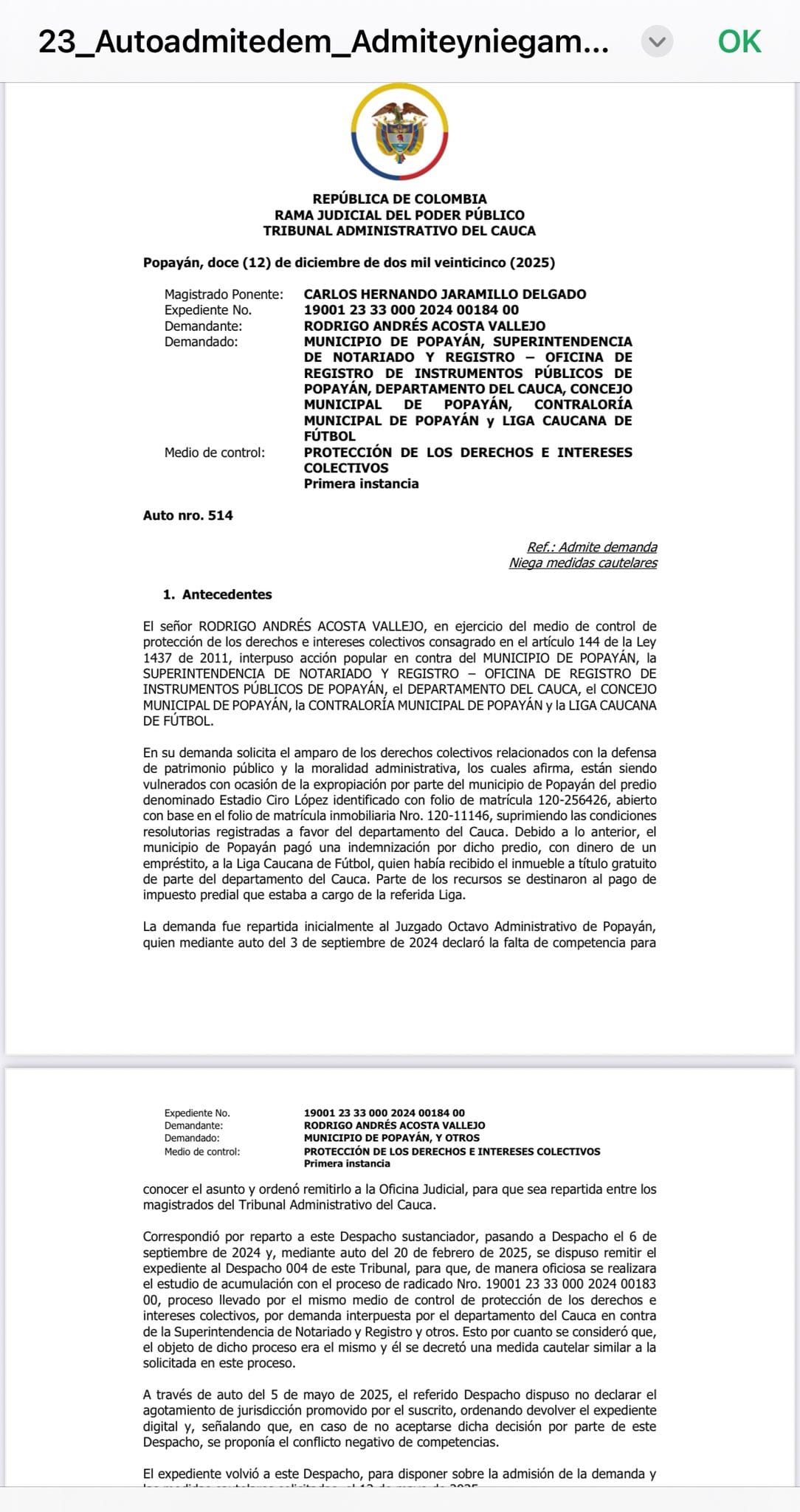 Lo que durante años ha sido denunciado por Periódico Virtual.com como una "historia de engaños" y un sistemático despojo a la ciudad, hoy llega a los estrados judiciales. El Tribunal Administrativo del Cauca admitió formalmente la Acción Popular que busca salvaguardar la moralidad administrativa y recuperar el Estadio Ciro López, poniendo en el banquillo a las entidades que, por acción u omisión, permitieron que un bien de uso público terminara convertido en un activo privado objeto de especulación inmobiliaria.