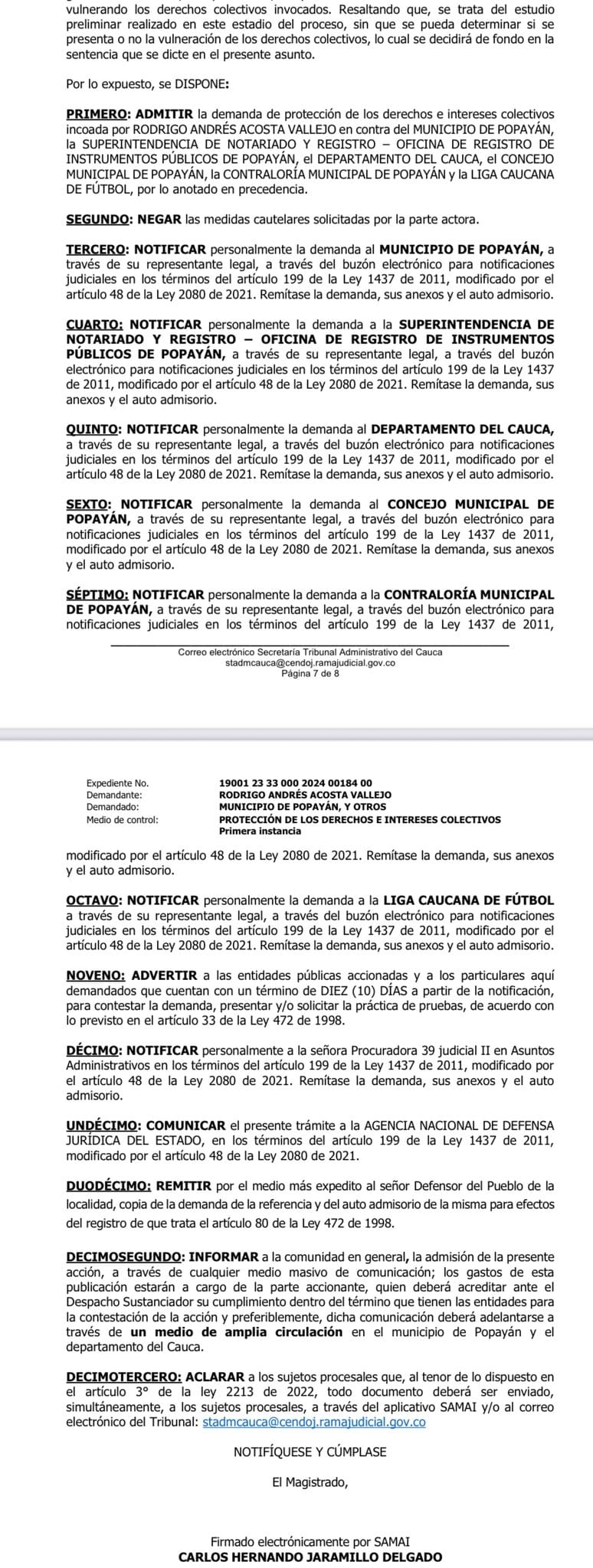 Aunque el Tribunal negó las medidas cautelares inmediatas (como embargos preventivos en esta etapa), la admisión de la demanda es la victoria jurídica más significativa para la ciudadanía en años. Ahora, las entidades demandadas tienen 10 días para contestar y justificar sus actuaciones. La Liga Caucana de Fútbol deberá demostrar por qué actúa como dueña de un bien que, moral y jurídicamente, se reclama como público.