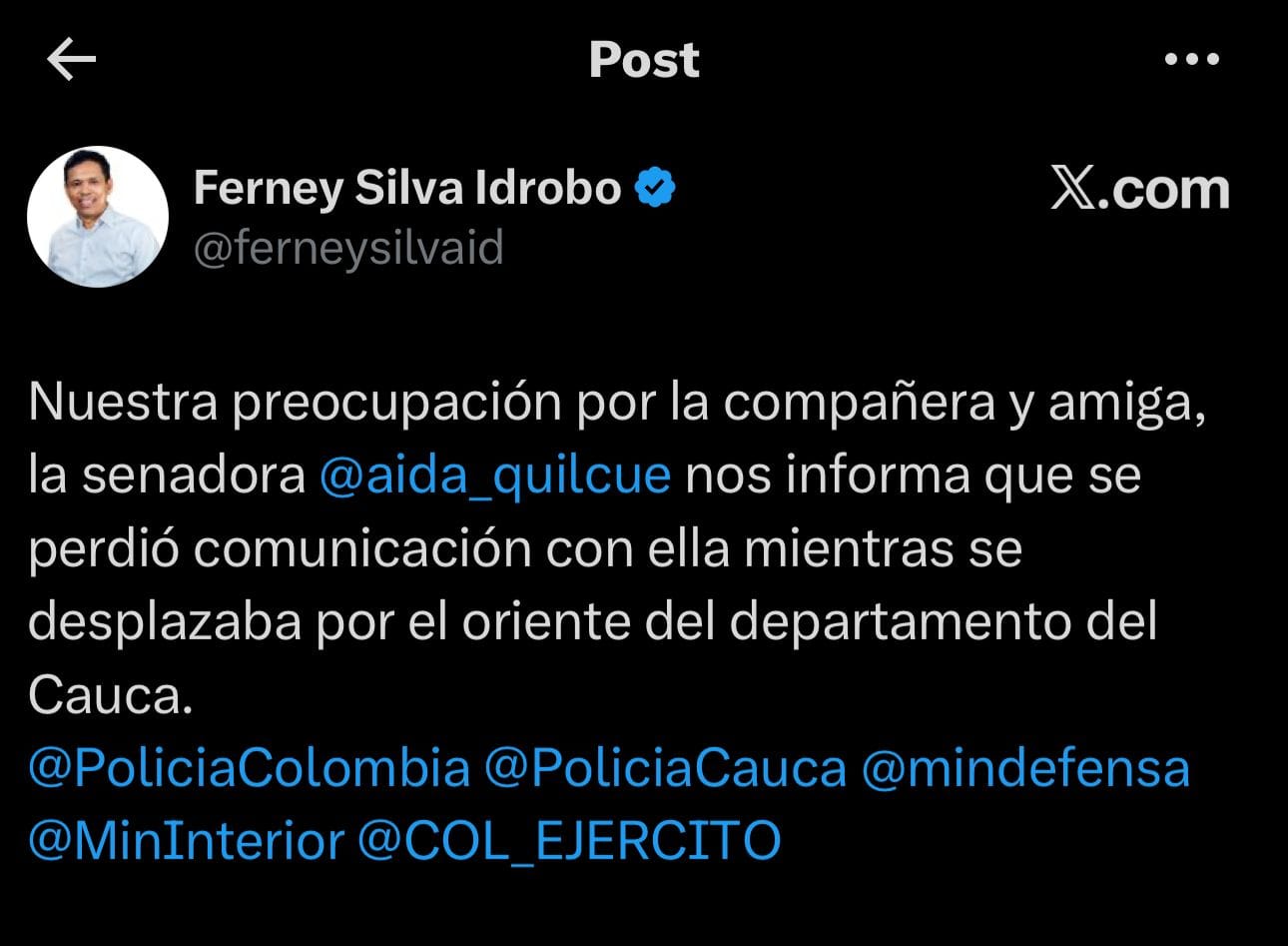 "Atención @MinInterior @MinDefensa... mucha preocupación por la Senadora Aida Quilcué... perdimos comunicación con ella y su esquema desde la 1:00 pm aproximadamente", alertó el senador Ferney Silva, instando a una reacción inmediata de la Fuerza Pública.