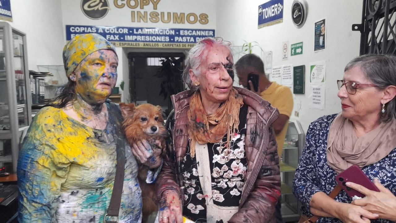 Uno de los momentos más indignantes fue cuando un estudiante tomó de manera brusca a una mujer mayor, la abrazó por la fuerza y terminó manchándola con pintura, mientras otros se burlaban y grababan la escena entre risas.